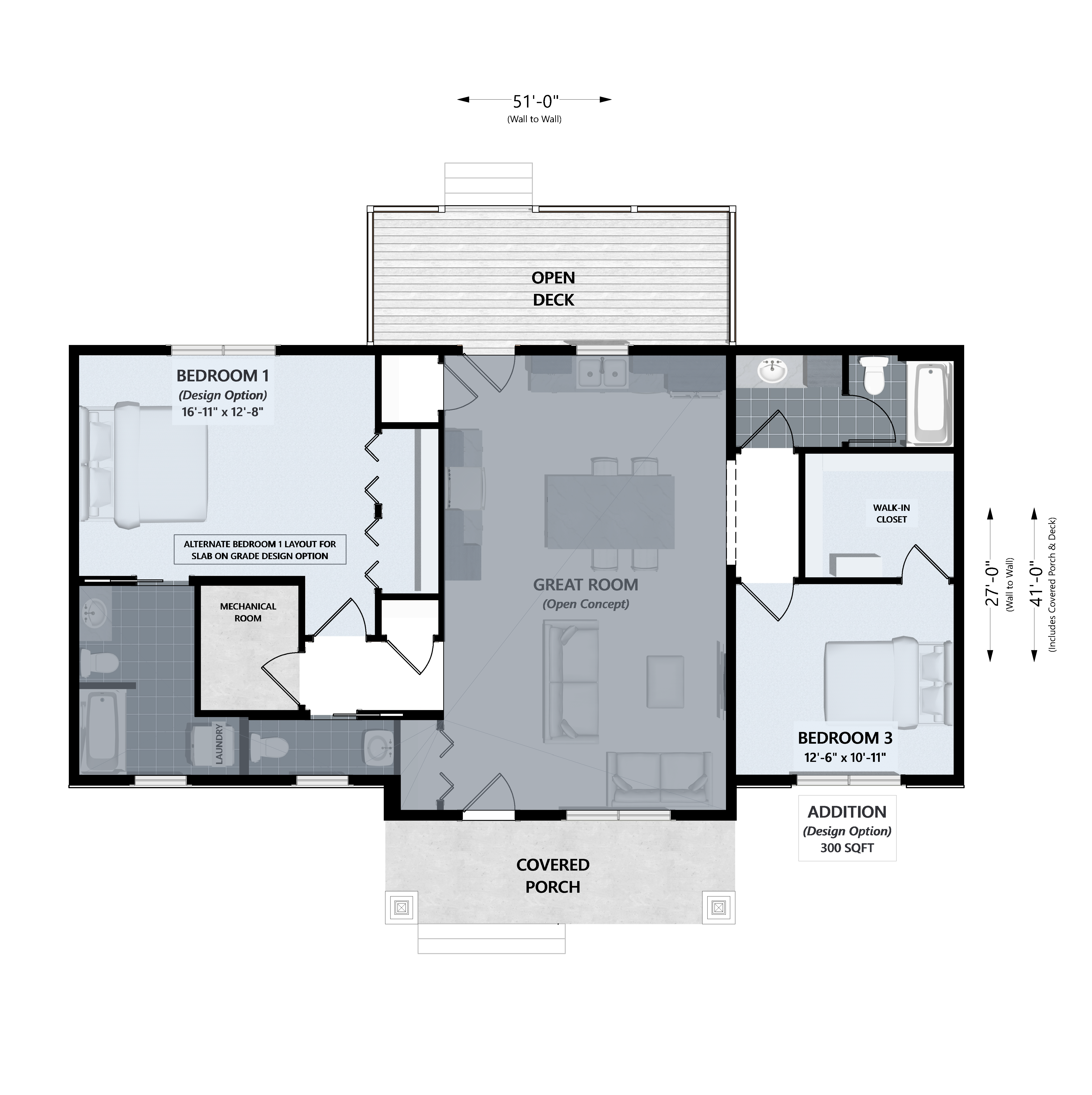 For homeowners who want the option to expand over time, the Moonstone offers flexible additions. An optional 300-square-foot main-level expansion extends the right side of the home, adding a second bedroom with a walk-in closet and a full bathroom. An optional finished lower level adds 820 square feet of additional living space, including a family room, an extra bedroom, a full bathroom, and mechanical/storage space — ideal for guests, hobbies, or growing families.