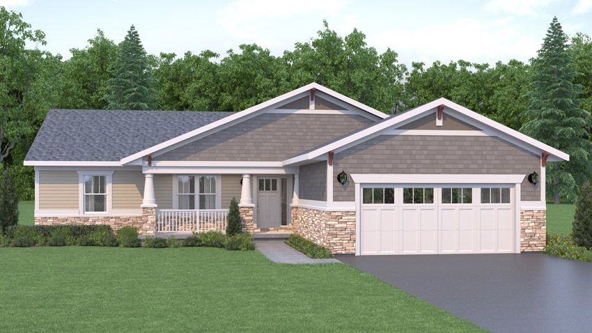 Exterior rendering of Elderberry floor plan, with 3 bedrooms and 2 bathrooms Shingle