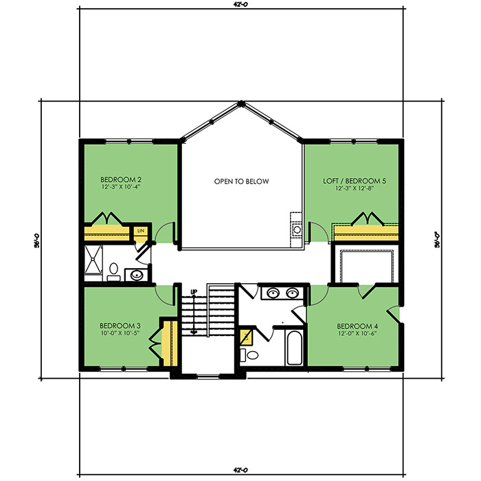 A part of our Vacation Series, the Kenyon Springs floor plan features 5 bedrooms and 3.5 bathrooms with a foot print of 42x36 feet and 2258 total square feet of living space. Floor Plan #VL305