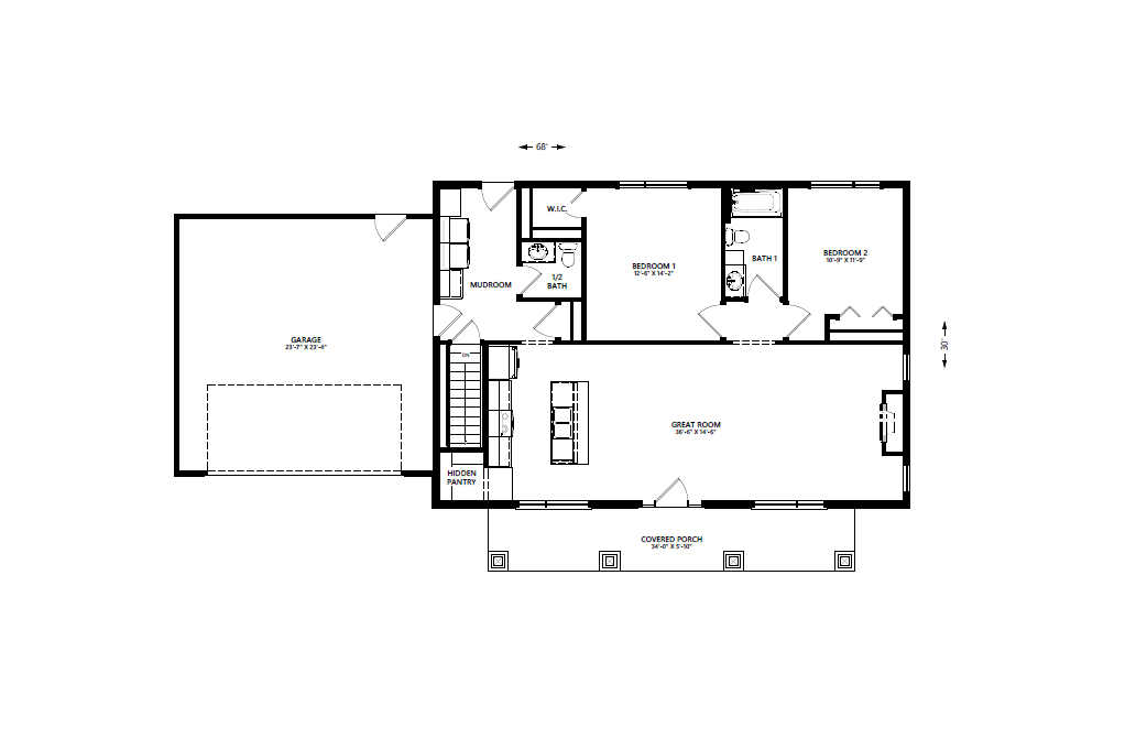 A part of our dream series, the tamarack floor plan features 3 bedrooms and 1.5 bathrooms with a foot print of 44x30 feet and 1342 total square feet of living space.